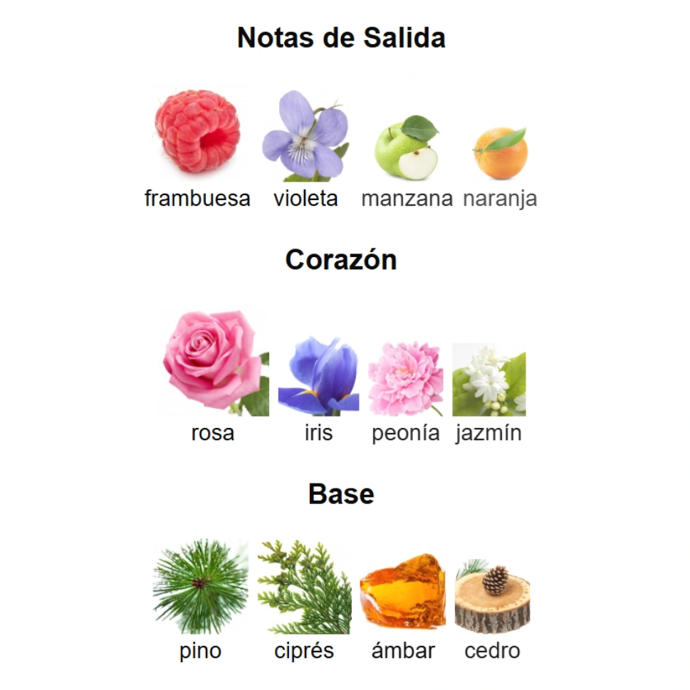 Frambuesa, violeta, manzana y naranja — una apertura jugosa y chispeante que fusiona frutas frescas y flores ligeras para captar atención desde los primeros instantes.