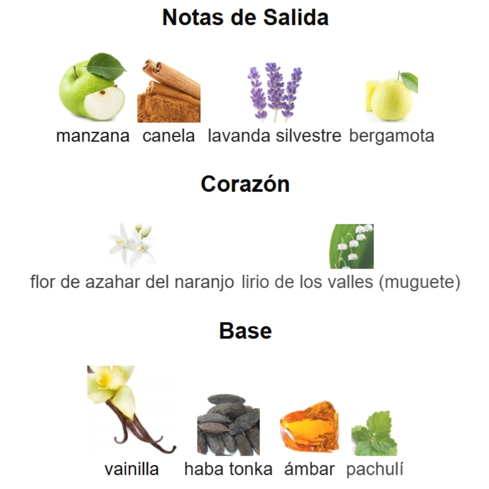 🍎 Salida: Manzana, canela, lavanda silvestre y bergamota – Una apertura vibrante y especiada que seduce al instante.