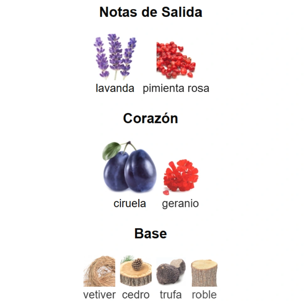 Vetiver, cedro, trufa y roble — una base amaderada y terrosa con un toque oscuro que otorga profundidad y una masculinidad intensa.