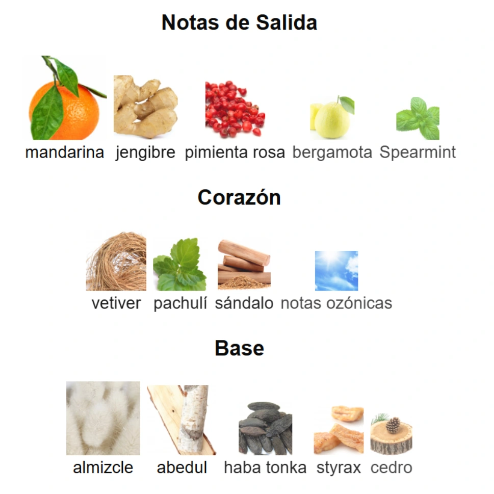 🍊 Salida: Mandarina, jengibre, pimienta rosa, bergamota y menta verde (spearmint) – Un inicio fresco, especiado y jugoso que energiza al instante. Vibrante y chispeante, perfecto para el día a día.
