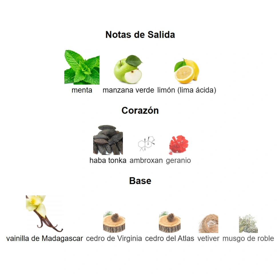 Menta, manzana verde y limón (lima ácida) — una apertura fresca, chispeante y energizante, con un contraste entre lo cítrico y lo herbal que define el carácter moderno y juvenil del perfume.