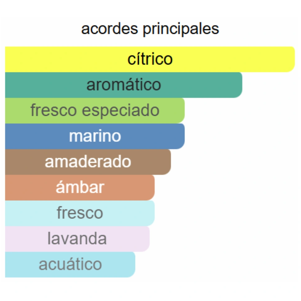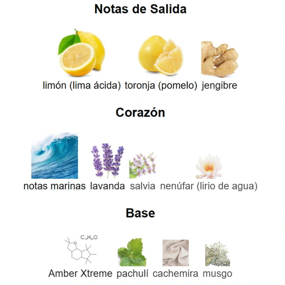 Notas marinas, lavanda, salvia y nenúfar (lirio de agua) — un corazón acuático y aromático que evoca una brisa oceánica fresca, limpia y ligeramente floral, perfecta para una sensación de libertad y aventura.