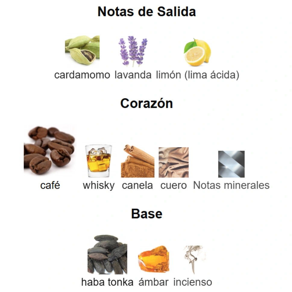 🥃 Corazón: Café, whisky, canela, cuero, notas minerales – Aquí es donde la fragancia muestra su personalidad real: una taza de café negro, con un chorrito de whisky y un toque especiado de canela, todo suavizado por un cuero discreto y una sensación metálica/mineral que le da un aire contemporáneo.