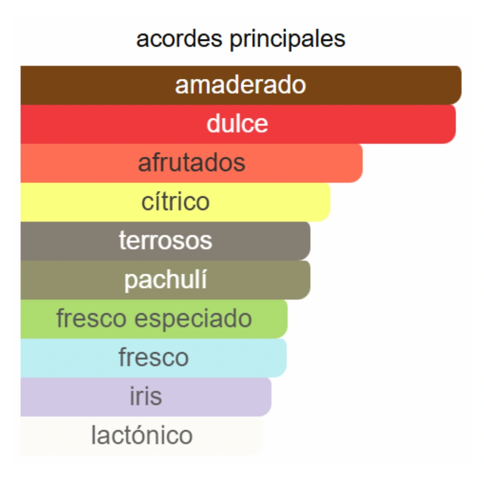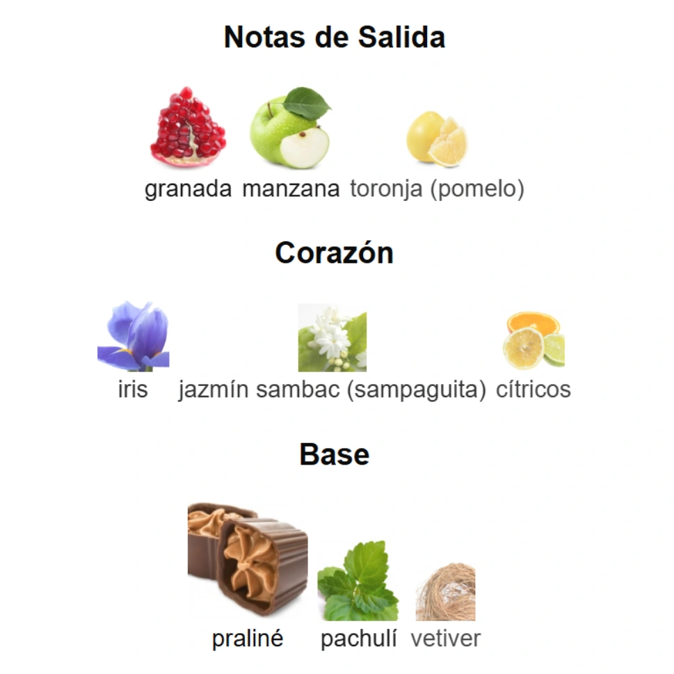 Praliné, pachulí y vetiver — una base dulce, terrosa y ligeramente oriental que envuelve con calidez y sensualidad.
