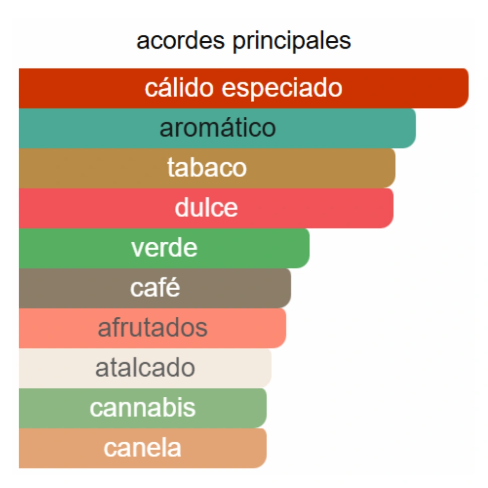 El azafrán aporta calidez lujosa, el acorde de cannabis da un toque verde, resinoso y ligeramente terroso; el tomillo y las notas verdes añaden frescura aromática, mientras que la davana introduce un matiz afrutado-licoroso que vuelve la salida intrigante y diferente.