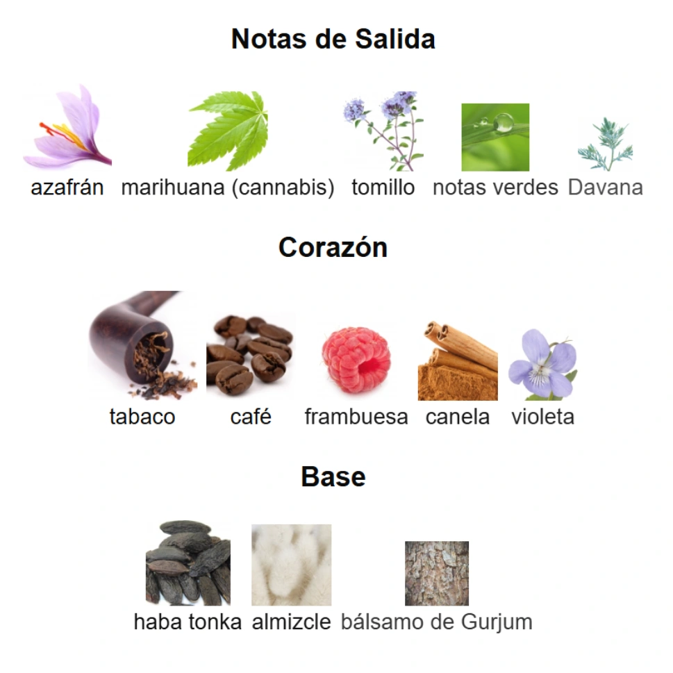 Azafrán, marihuana (cannabis), tomillo, notas verdes y davana — una apertura intensa, especiada y herbácea con un aire provocador.