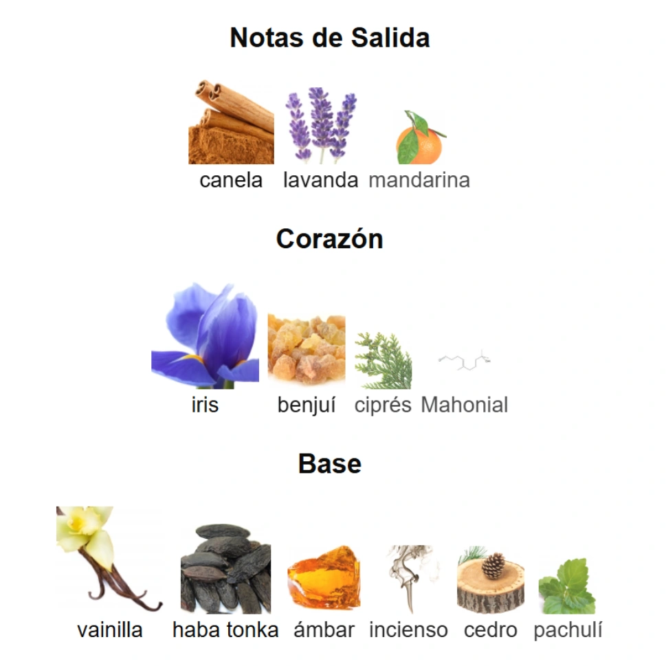 Canela, lavanda y mandarina — un inicio especiado, aromático y ligeramente cítrico que despierta con fuerza y frescura vibrante.