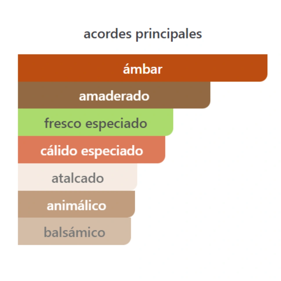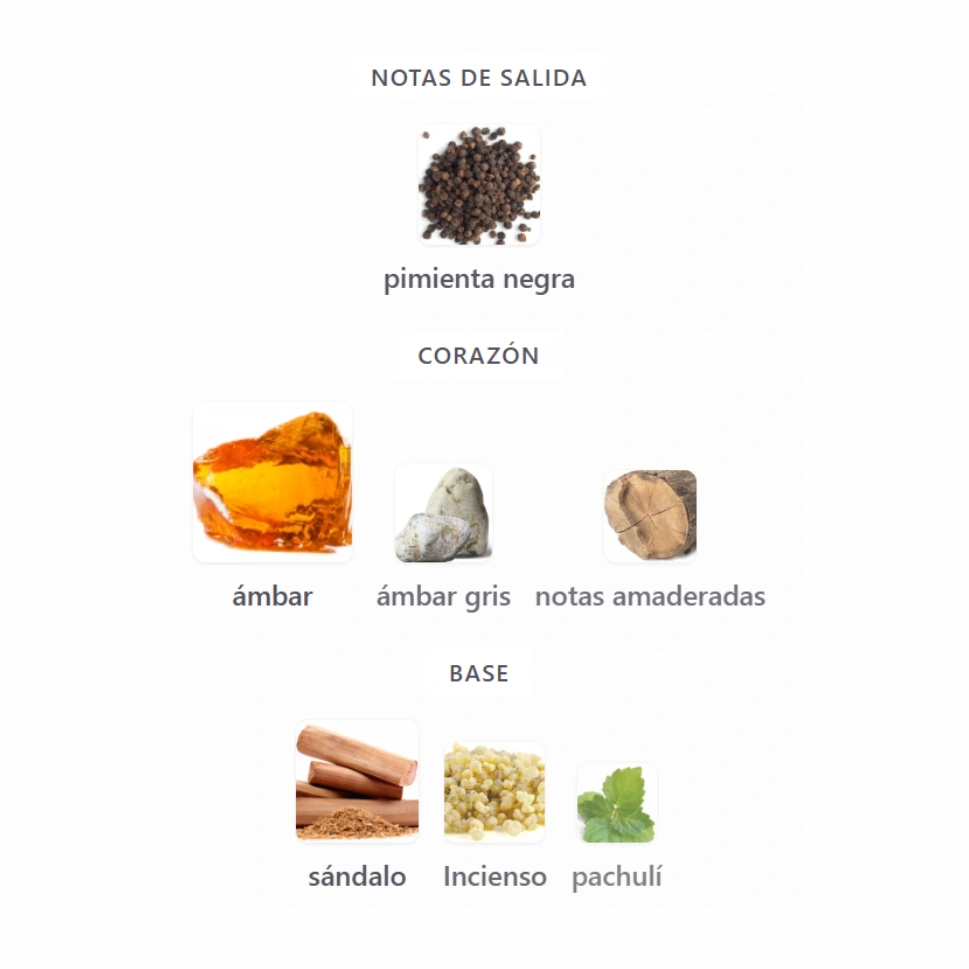 El ámbar aporta una calidez envolvente y sensual, el ámbar gris añade una dimensión sofisticada y ligeramente marina, mientras que las notas amaderadas refuerzan la estructura masculina de la fragancia.