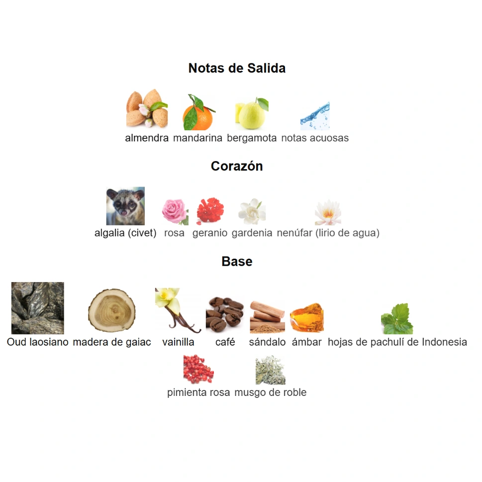 El inicio es ligeramente fresco, con un toque cítrico frutal acompañado por una almendra cremosa y amarga, que sugiere ya el tono más gourmand y opulento. Las notas acuáticas aportan un matiz húmedo que, en esta versión, dura poco: es solo la antesala a lo más profundo.