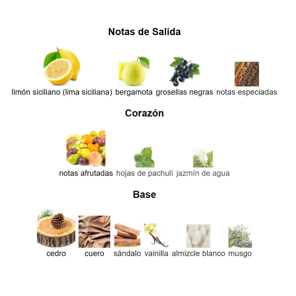 Limón siciliano, bergamota, grosellas negras y notas especiadas — una apertura vibrante, chispeante y jugosa. El limón aporta un frescor limpio, la bergamota refina la mezcla y la grosella negra añade un toque afrutado ácido y moderno. Las notas especiadas le dan un carácter elegante desde el inicio.