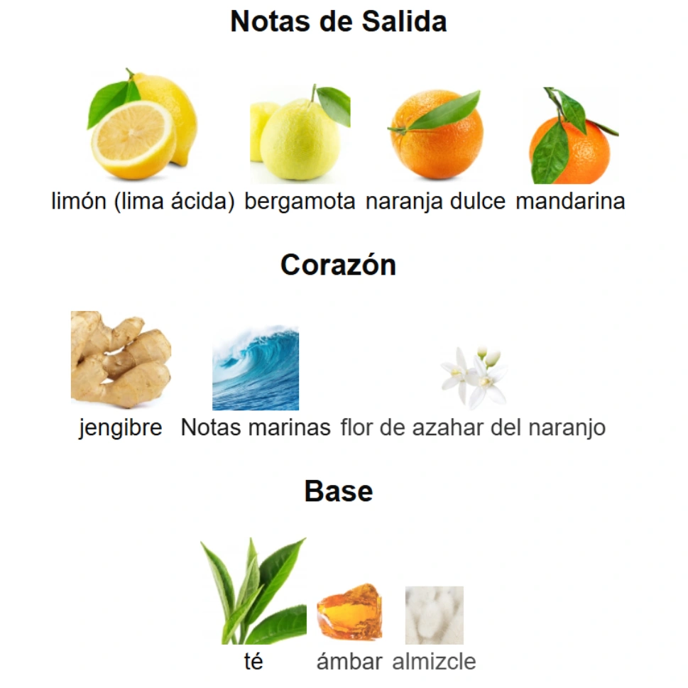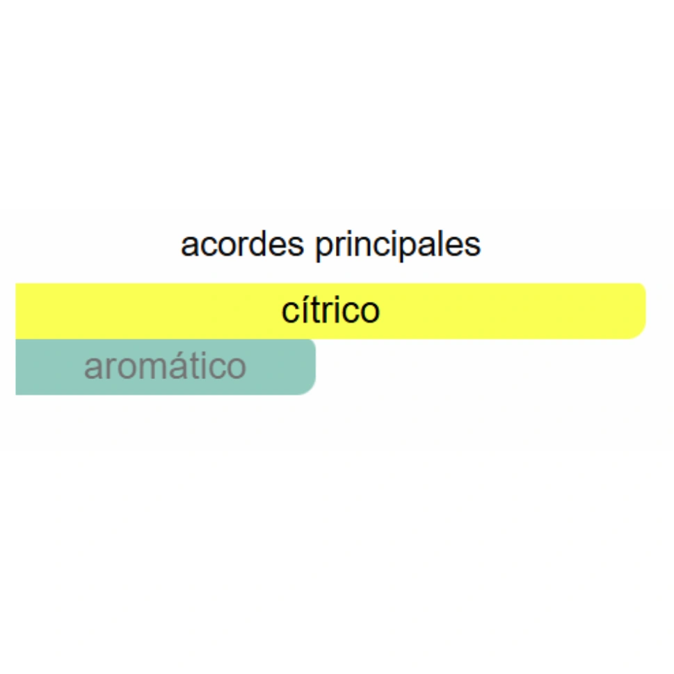 🍋 Notas de Salida: Limón (lima ácida), naranja dulce, mandarina y bergamota.