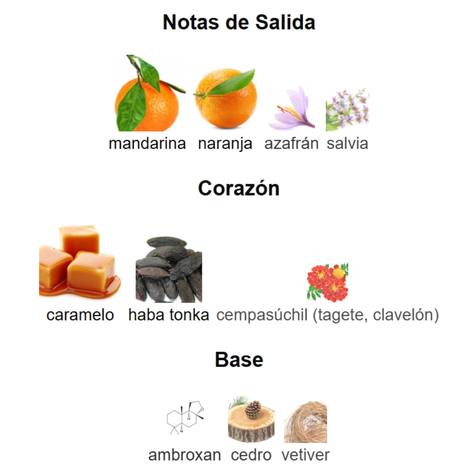 🍊 Notas de Salida: Mandarina, naranja, azafrán y salvia.