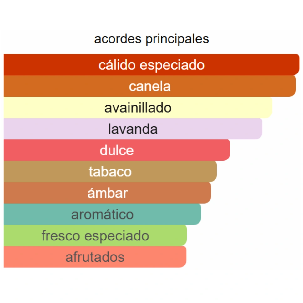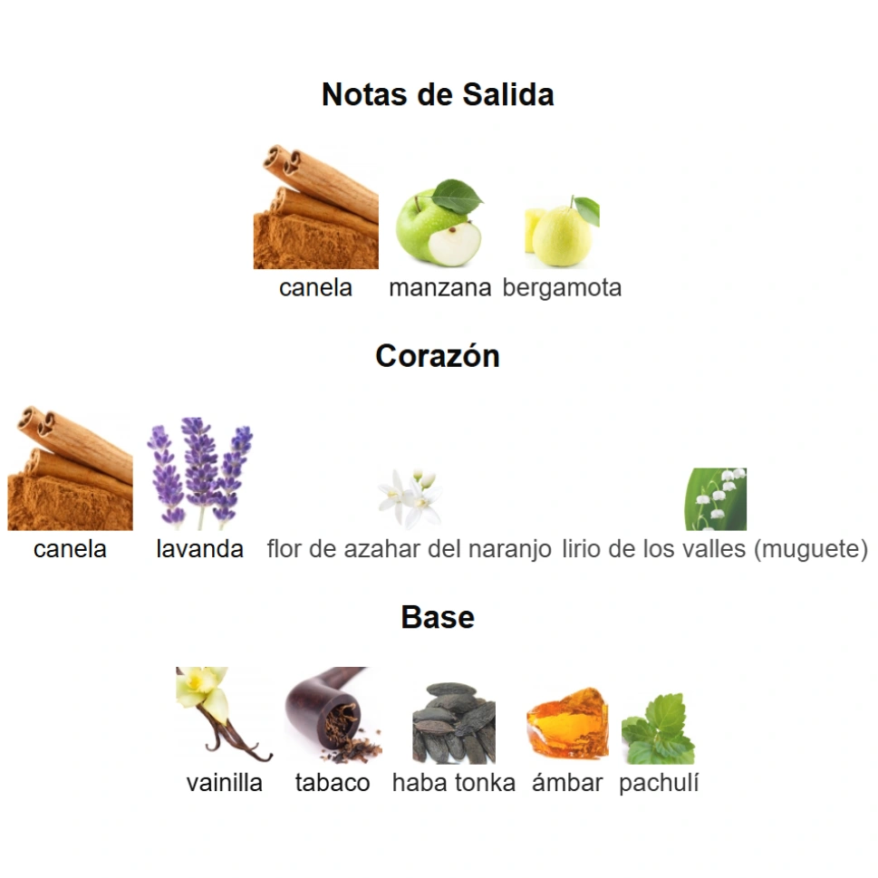 Canela, manzana y bergamota — una combinación vibrante y envolvente que abre con un dulzor especiado y frutal lleno de energía.
