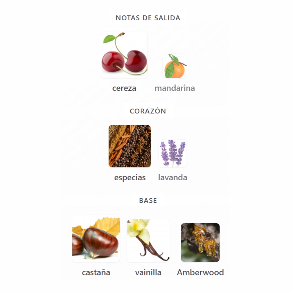 La castaña aporta ese ADN característico tostado y reconfortante, la vainilla intensifica el lado gourmand con suavidad adictiva y el Amberwood refuerza la estructura con un toque amaderado moderno y duradero.