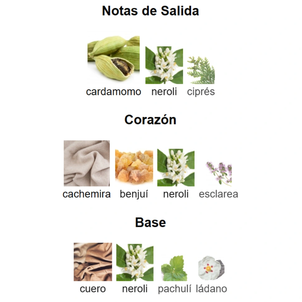 🧥 Fondo: Cuero, pachulí, ládano y más neroli – La base revela su verdadero carácter: cuero oscuro y resinoso, con una sensualidad ahumada que lo convierte en un perfume intenso y magnético. El ládano añade profundidad, mientras que el pachulí equilibra con un matiz terroso.