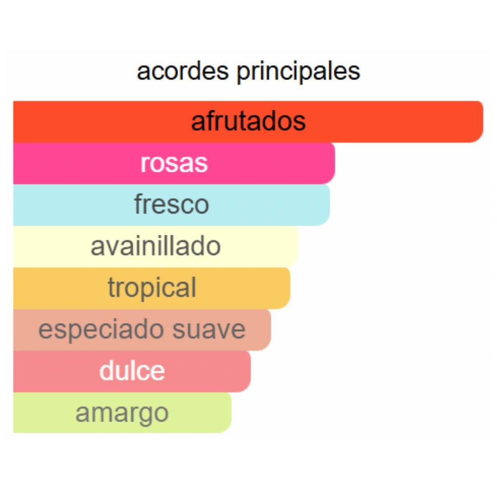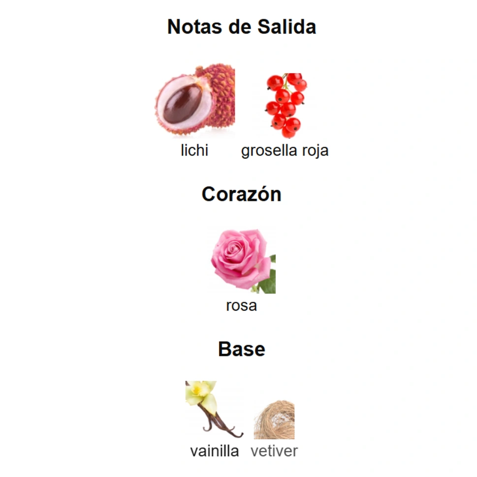 Lichi y grosella roja — una apertura chispeante y exótica, dulce pero fresca, con un toque ácido que despierta los sentidos.