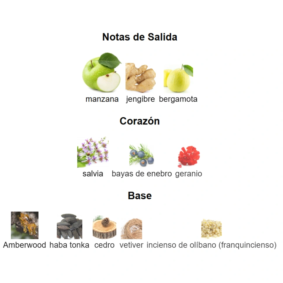 Salvia, bayas de enebro y geranio — un corazón aromático y masculino que aporta carácter, equilibrio verde y una sutil intensidad herbal que evoca confianza natural.